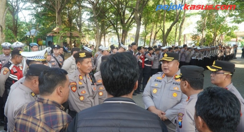 Apel persiapan pengamanan berlangsung di Bangkodir, Jl. Raden Ajeng Kartini, Bangil, dipimpin langsung oleh Kapolres Pasuruan, AKBP Jazuli Dani Iriawan, S.I.K., M.Tr.Opsla.