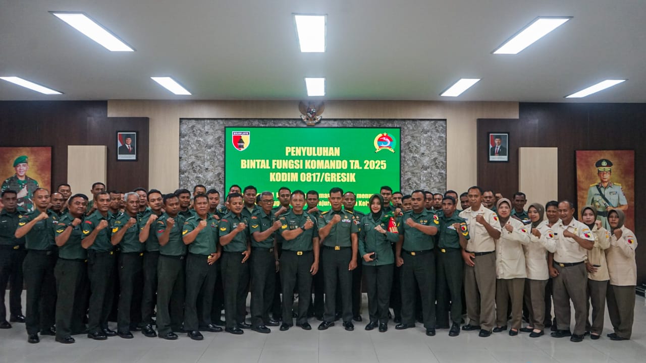 Gresik, pojokkasus.com — Kodim 0817/Gresik menggelar kegiatan Penyuluhan Bintal Fungsi Komando Tahun 2025 bertempat di Aula Makodim 0817/Gresik. Dengan mengangkat tema “Implementasi Bintal Fungsi Komando dalam Menurunkan Angka Pelanggaran Disersi Prajurit, PNS dan Keluarga”, kegiatan ini diikuti oleh anggota dan PNS Kodim 0817/Gresik dan perwakilan Koramil jajaran. Rabu (26/11/2025).
