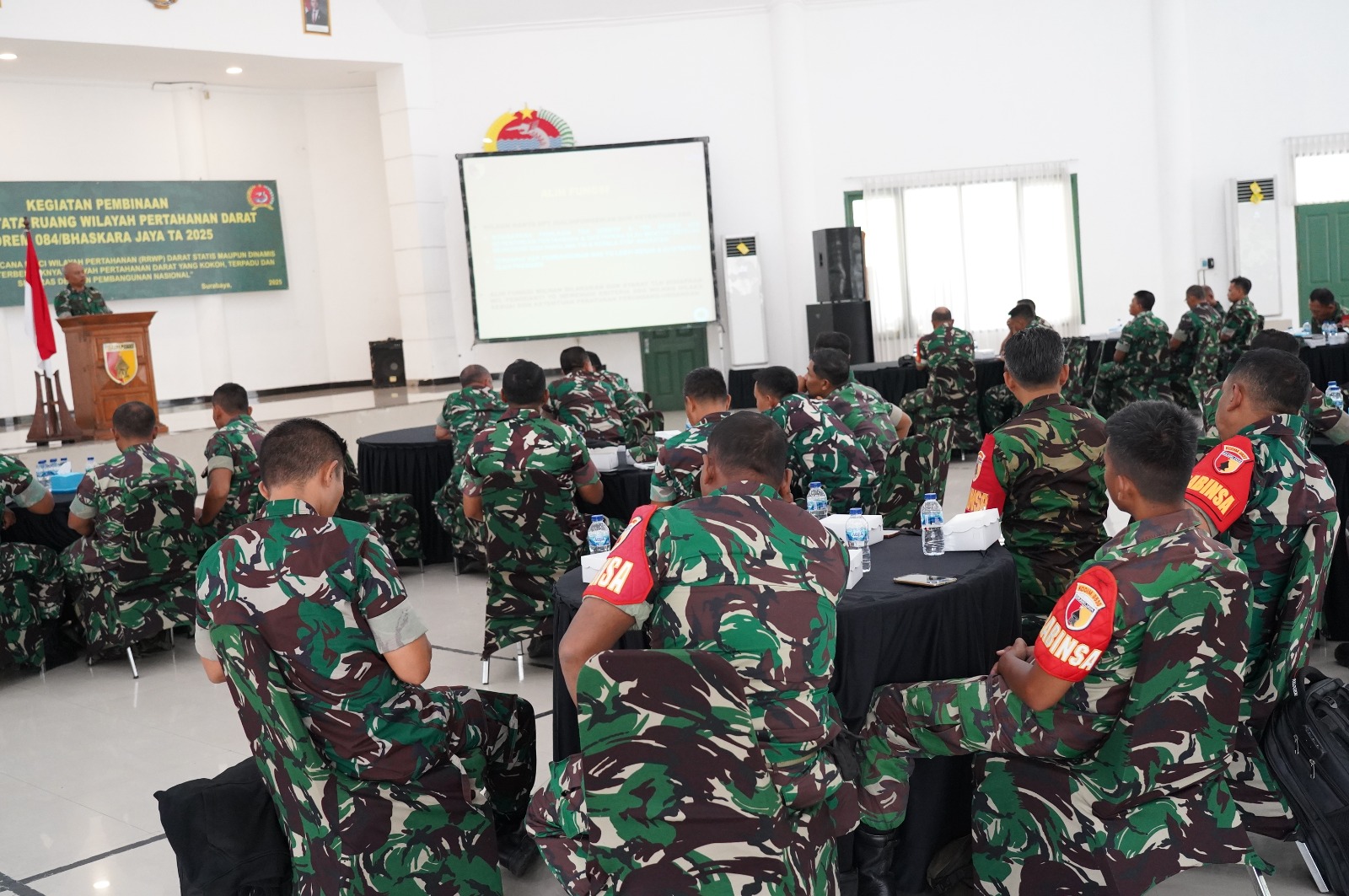 Surabaya, pojokkasus.com – Korem 084/Bhaskara Jaya menggelar kegiatan Pembinaan Rencana Tata Ruang Wilayah Pertahanan (RTRW) Darat Tahun Anggaran 2025 di Aula Bhaskara Makorem 084/BJ, Jalan Ahmad Yani No. 1, Surabaya, Kamis (27/11/2025). Kegiatan ini mengusung tema “Terwujudnya Rencana Rinci Wilayah Pertahanan (RRWP) Darat Status Maupun Dinamis Guna Mendukung Terbentuknya Wilayah Pertahanan Darat yang Kokoh, Terpadu dan Selaras dengan Pembangunan Nasional.”