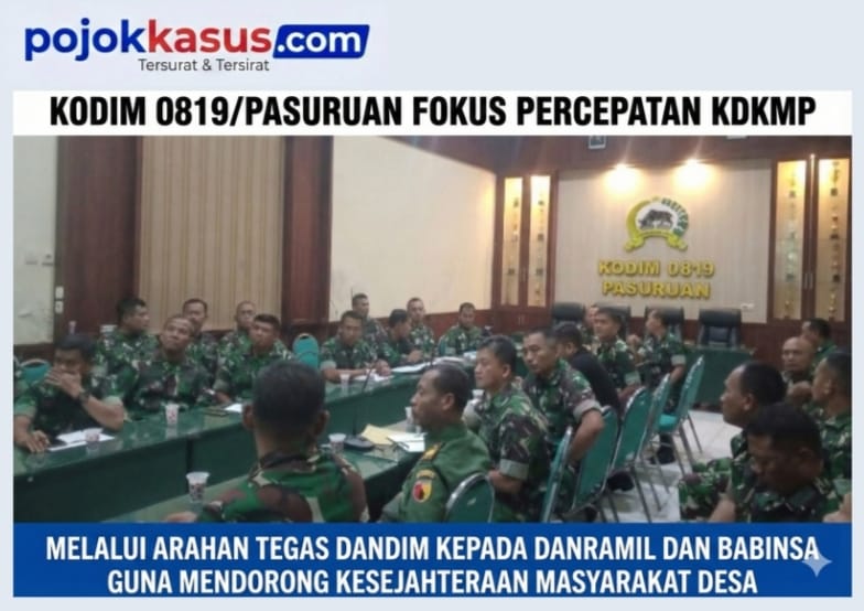 Pasuruan, pojokkasus.com – Percepatan KDKMP menjadi fokus utama Komandan Kodim 0819/Pasuruan, Letkol Inf Boga Bramiko, M.Han., saat memberikan Arahan kepada seluruh Danramil dan Babinsa jajaran Kodim 0819/Pasuruan. Arahan tersebut disampaikan dalam rapat koordinasi yang digelar di Ruang Data Makodim 0819/Pasuruan, Jalan Veteran Nomor 5, Kota Pasuruan, Jawa Timur, Jumat (16/01/2026).