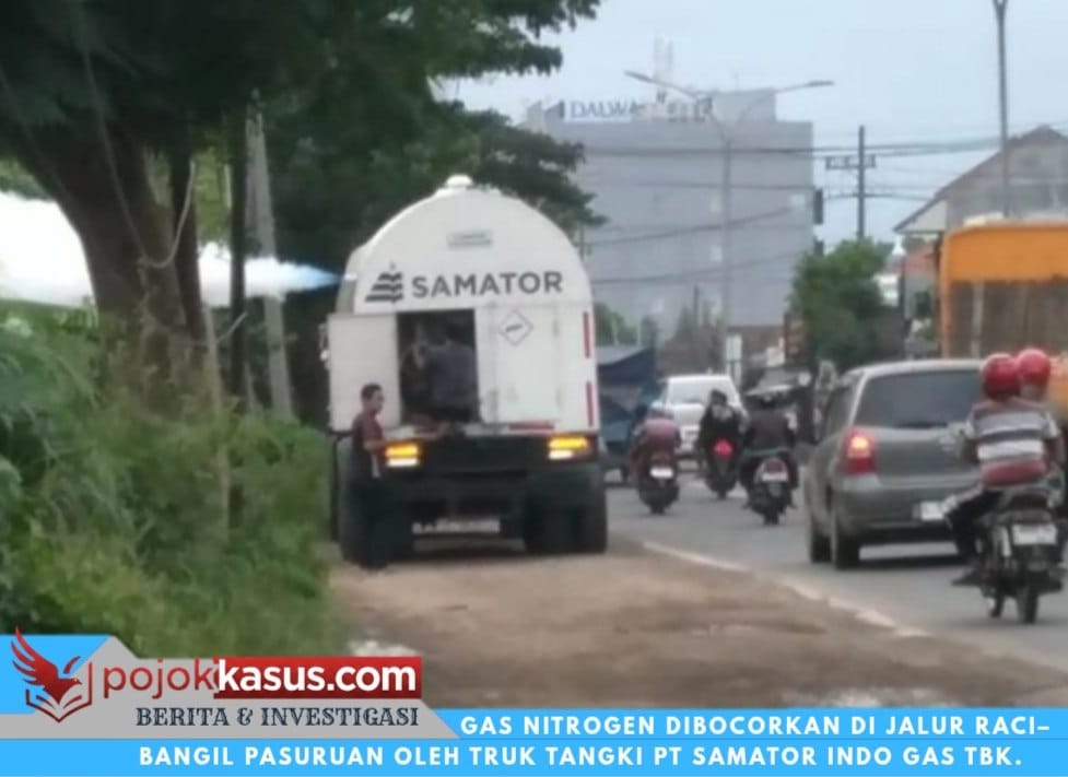 Sebuah truk tangki milik PT Samator Indo Gas Tbk terlihat melepaskan gas nitrogen ke ruang terbuka di bahu jalan Jl. Raya Raci–Bangil. Jalur tersebut merupakan akses vital masyarakat dengan arus kendaraan tinggi, terutama saat jam pulang kerja. Aksi pelepasan gas langsung menyita perhatian pengendara dan warga sekitar.