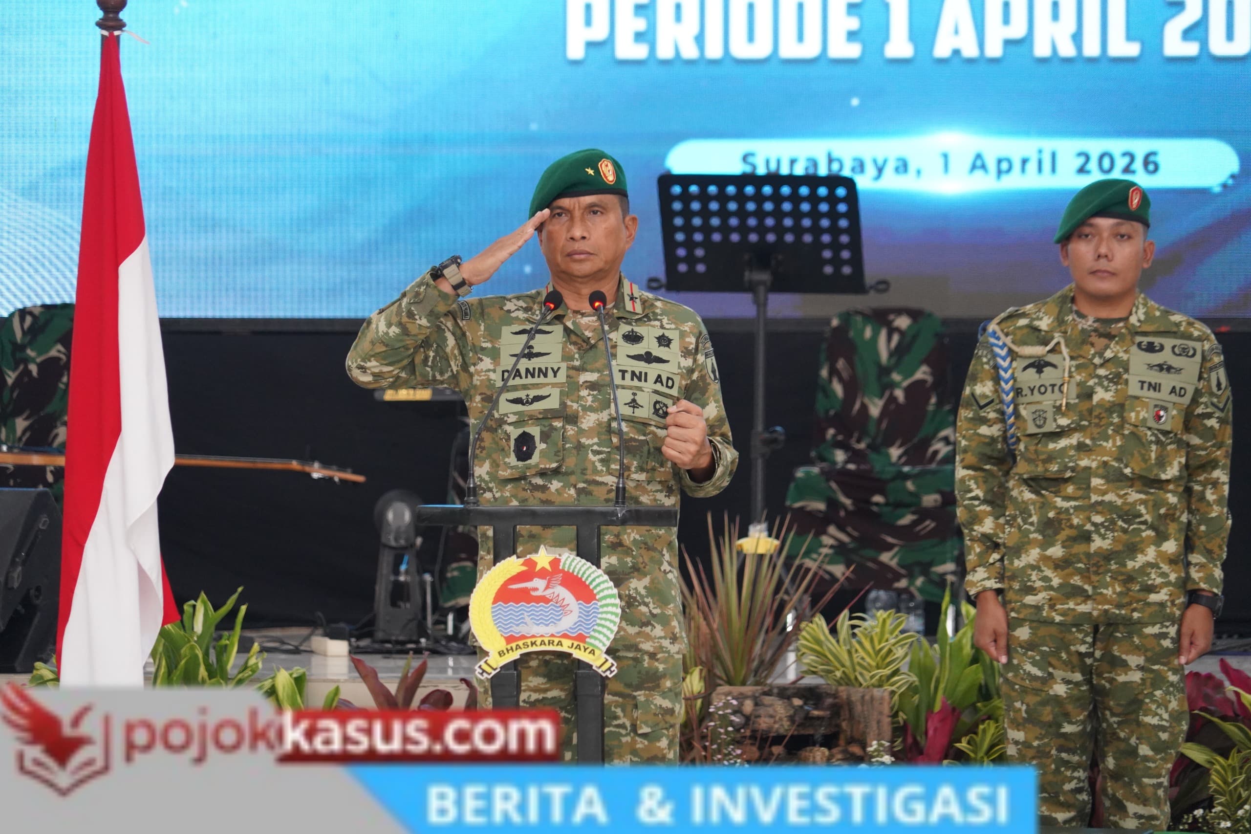 Surabaya,pojokkasus.com – Danrem 084 Bhaskara Jaya memimpin langsung upacara kenaikan pangkat dan halal bihalal pada Rabu (1/4/2026) di Aula Makorem, Jalan Ahmad Yani No.1, Wonocolo.
