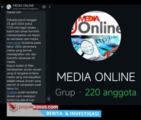 Sidiarjo, pojokkasus.com – Ada apa di balik Advetorial Kominfo Sidoarjo yang membatasi anggaran penerima tahun 2026 hanya untuk 65 media memicu badai kritik luas. Keputusan yang viral di grup WhatsApp dan media sosial pada Kamis (23/4/2026) ini menuai tanda tanya besar, mengingat dari total sekitar 220 media yang terdata, ratusan lainnya justru tersisihkan tanpa penjelasan yang memuaskan.